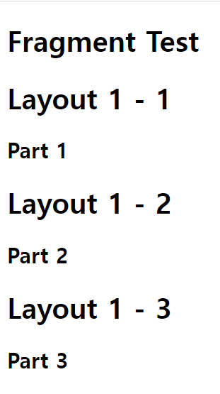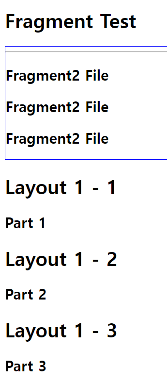 <div> <hr/> <h2>Fragment2 File</h2> <h2>Fragment2 File</h2> <h2>Fragment2 File</h2> </div>exLayout1.html에 fragment2.html 전체를 사용하는 코드 추가