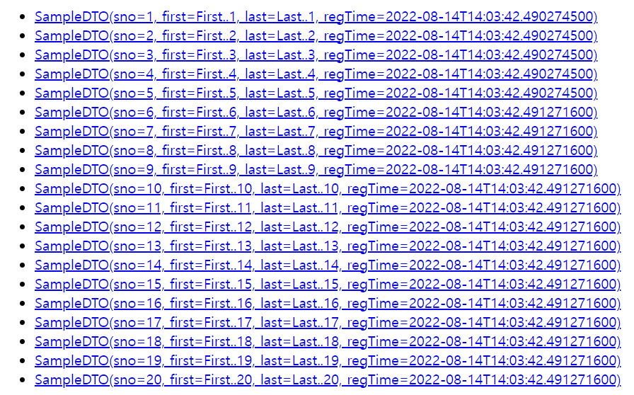 <!DOCTYPE html> <html lang="en" xmlns:th="http://www.thymeleaf.org"> <head> <meta charset="UTF-8"> <title>Title</title> </head> <body> <ul> <li th:each="dto : ${list}" > <a th:href="@{/sample/exView}">[[${dto}]]</a> </li> </ul> </body> </html>