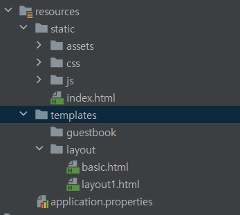 @GetMapping({"/exLayout1", "/exLayout2", "/exTemplate"}) public void exLayout1() { log.info("exLayout..........."); }layout/layout1.html 을 사용하기 위하여 앞으로 만들 /exTemplate 추가