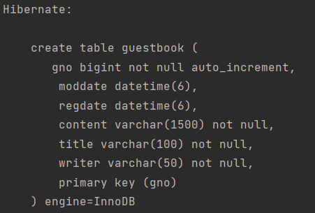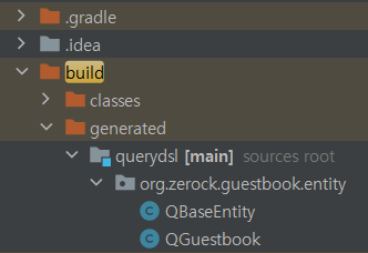 @SpringBootApplication @EnableJpaAuditing public class GuestbookApplication { public static void main(String[] args) { SpringApplication.run(GuestbookApplication.class, args); } }[엔티티 클래스와 Querydsl 설정]