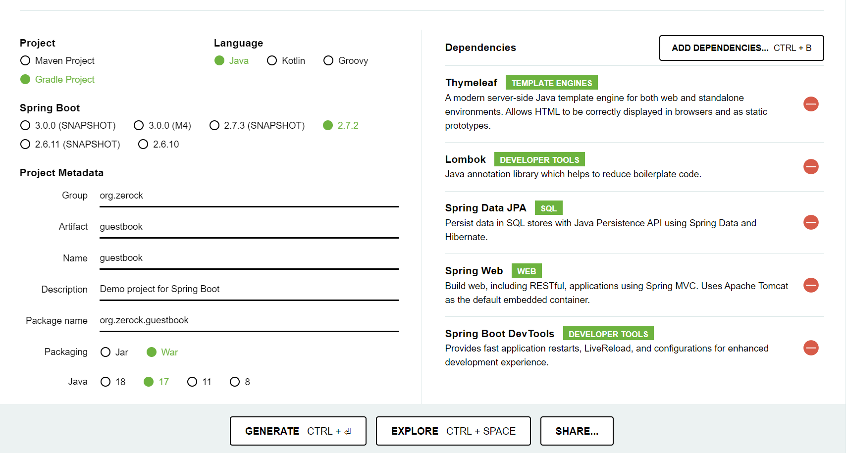 package org.zerock.guestbook.controller; import lombok.extern.log4j.Log4j2; import org.springframework.stereotype.Controller; import org.springframework.web.bind.annotation.GetMapping; import org.springframework.web.bind.annotation.RequestMapping; @Controller @RequestMapping("/guestbook") @Log4j2 public class GuestbookController { @GetMapping({"/", "/list"}) public String list(){ log.info("list............"); return "/guestbook/list"; } }/templates/guestbook/list.html