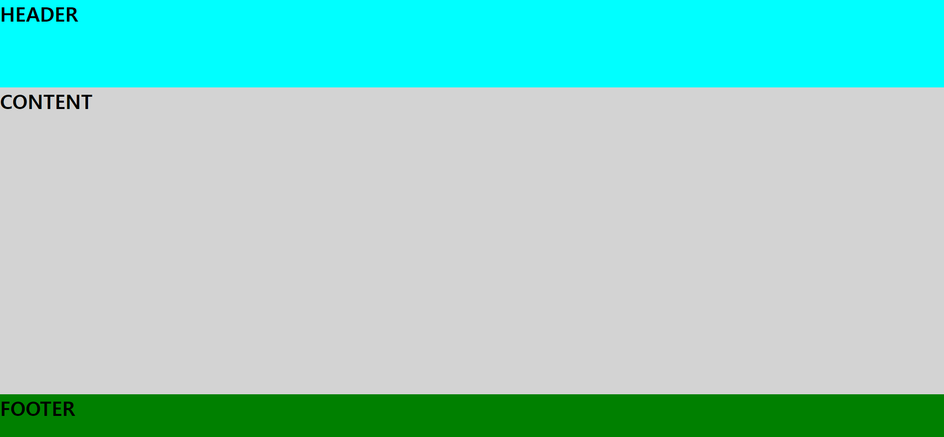 파일 위치 <!DOCTYPE html> <html lang="en" xmlns:th="http://www.thymeleaf.org"> <head> <meta charset="UTF-8"> <title>Title</title> </head> <body> <style> * { margin: 0; padding: 0; } .header { width:100vw; height: 20vh; background-color: aqua; } .content { width: 100vw; height: 70vh; background-color: lightgray; } .footer { width: 100vw; height: 10vh; background-color:green; } </style> <div class="header"> <h1>HEADER</h1> </div> <div class="content" > <h1>CONTENT</h1> </div> <div class="footer"> <h1>FOOTER</h1> </div> </body> </html>