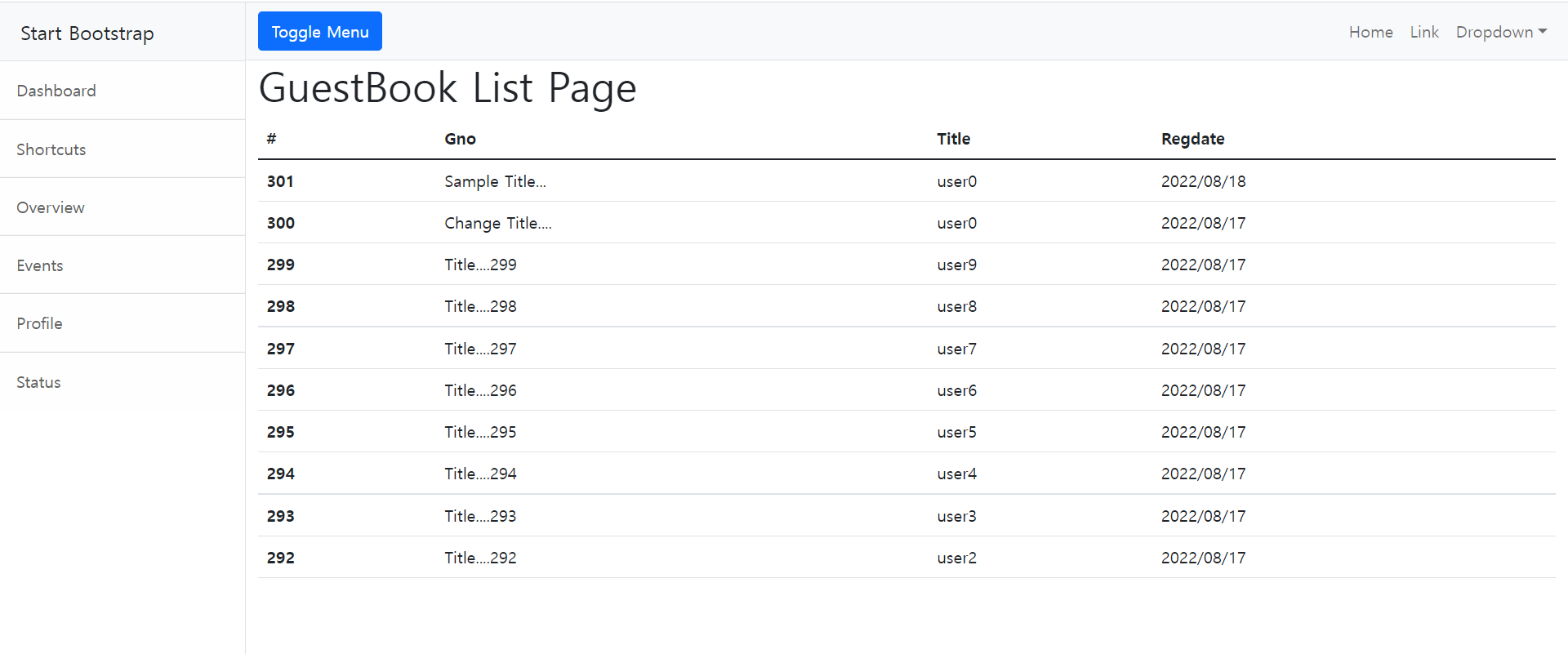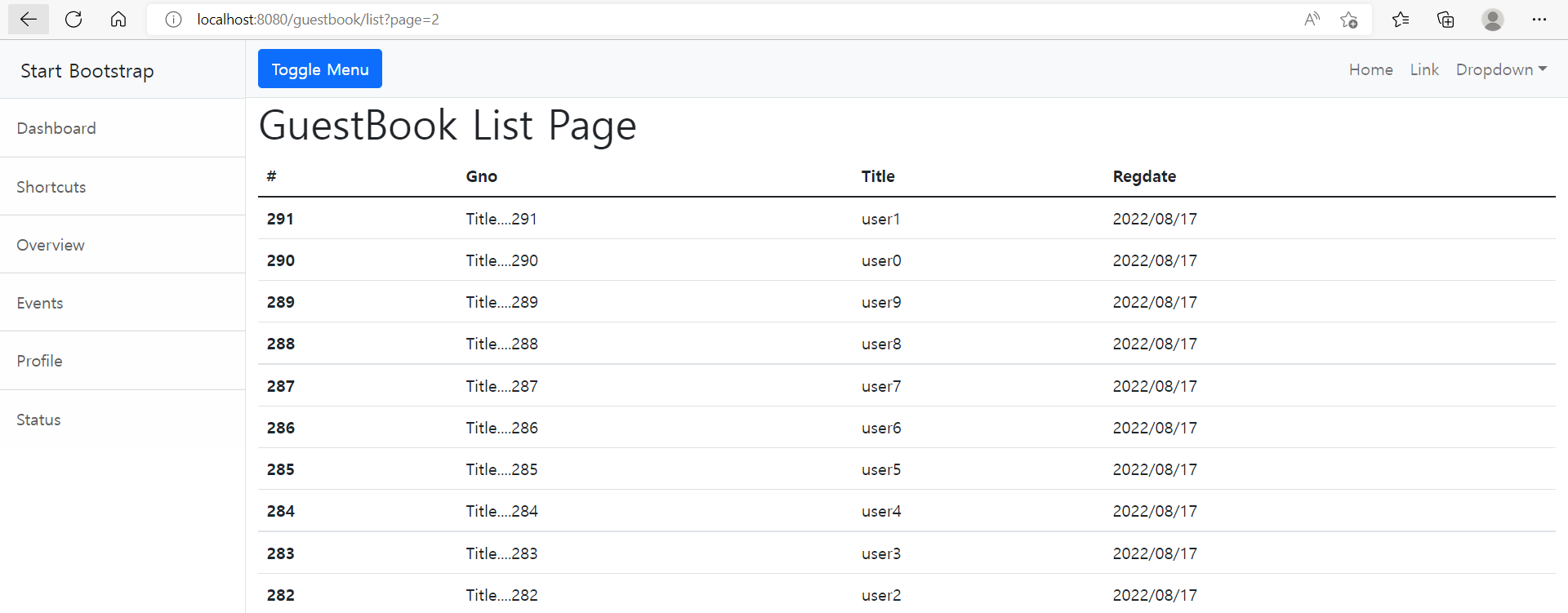 <!DOCTYPE html> <html lang="en" xmlns:th="http://www.thymeleaf.org"> <th:block th:replace="~{/layout/basic :: setContent(~{this::content} )}"> <th:block th:fragment="content"> <h1>GuestBook List Page</h1> <table class="table table-stripped"> <thead> <tr> <th scope="col">#</th> <th scope="col">Gno</th> <th scope="col">Title</th> <th scope="col">Regdate</th> </tr> </thead> <tbody> <tr th:each="dto : ${result.dtoList}" > <th scope="row">[[${dto.gno}]]</th> <td>[[${dto.title}]]</td> <td>[[${dto.writer}]]</td> <td>[[${#temporals.format(dto.regDate, 'yyy/MM/dd')}]]</td> </tr> </tbody> </table> </th:block> </th:block>list.html로 전달된 dtoList를 이용해서 GuestbookDTO 출력