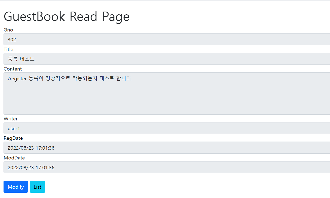 <!DOCTYPE html> <html lang="en" xmlns:th="http://www.thymeleaf.org"> <th:block th:replace="~{/layout/basic :: setContent(~{this::content})}"> <th:block th:fragment="content"> <h1 class="mt-4">GuestBook Read Page</h1> <div class="form-group"> <label>Gno</label> <input type="text" class="form-control" name="gno" th:value="${dto.gno}" readonly> </div> <div class="form-group"> <label>Title</label> <input type="text" class="form-control" name="title" th:value="${dto.title}" readonly> </div> <div class="form-group"> <label>Content</label> <textarea class="form-control" rows="5" name="content" readonly>[[${dto.content}]]</textarea> </div> <div class="form-group"> <label>Writer</label> <input type="text" class="form-control" name="writer" th:value="${dto.writer}" readonly> </div> <div class="form-group"> <label>RegDate</label> <input type="text" class="form-control" name="regDate" th:value="${#temporals.format(dto.regDate, 'yyy/MM/dd HH:mm:ss')}" readonly> </div> <div class="form-group"> <label>ModDate</label> <input type="text" class="form-control" name="modDate" th:value="${#temporals.format(dto.modDate. 'yyyy/MM/dd HH:mm:ss')}" readonly> </div> <a href="@{/guestbook/modify(gno = ${dto.gno}, page=${requestDTO.page})}"><button type="button" class="btn btn-primary">Modify</button></a> <a href="@{/guestbook/list(page=${requestDTO.page})}}"><button type="button" class="btn btn-info">List</button></a> </th:block> </th:block> </html>(button을 위와 띄우기 위해 <br> 삽입함)