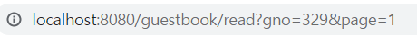 <tr th:each="dto : ${result.dtoList}" > <th scope="row"> <a th:href="@{/guestbook/read(gno = ${dto.gno}, page= ${result.page})}"> [[${dto.gno}]] </a> </th> <td>[[${dto.title}]]</td> <td>[[${dto.writer}]]</td> <td>[[${#temporals.format(dto.regDate, 'yyy/MM/dd')}]]</td> </tr>위처럼 gno에 링크를 걸어두고 이동하면 아래와 같이 적절한 gno와 page의 값을 가진 링크로 이동하게 된다.