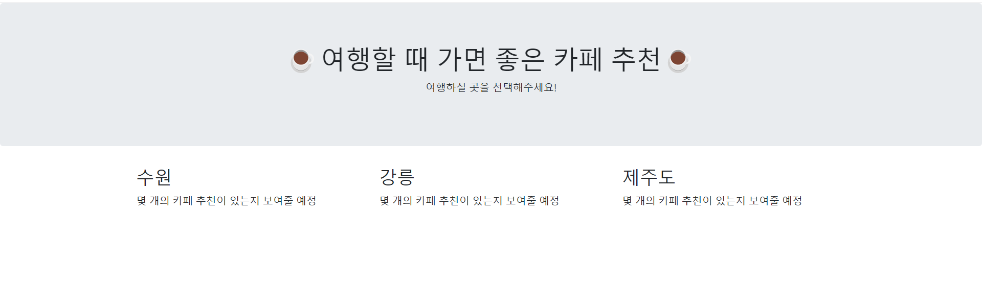 <!DOCTYPE html> <html lang="ko" xmlns:th="http://www.thymeleaf.org"> <head> <meta charset="UTF-8"> <title>Title</title> <meta name="viewport" content="width=device-width, initial-scale=1"> <link rel="stylesheet" href="https://cdn.jsdelivr.net/npm/bootstrap@4.6.1/dist/css/bootstrap.min.css"> <script src="https://cdn.jsdelivr.net/npm/jquery@3.6.0/dist/jquery.slim.min.js"></script> <script src="https://cdn.jsdelivr.net/npm/popper.js@1.16.1/dist/umd/popper.min.js"></script> <script src="https://cdn.jsdelivr.net/npm/bootstrap@4.6.1/dist/js/bootstrap.bundle.min.js"></script> </head> <body> <div class="jumbotron text-center"> <h1>☕여행할 때 가면 좋은 카페 추천☕</h1> <p>여행하실 곳을 선택해주세요!</p> </div> <div class="container"> <div class="row"> <div class="col-sm-4"> <h3>수원</h3> <p>몇 개의 카페 추천이 있는지 보여줄 예정</p> </div> <div class="col-sm-4"> <h3>강릉</h3> <p>몇 개의 카페 추천이 있는지 보여줄 예정</p> </div> <div class="col-sm-4"> <h3>제주도</h3> <p>몇 개의 카페 추천이 있는지 보여줄 예정</p> </div> </div> </div> </body> </html>그리고 현재 만드는 주제에 맞게 수정하고 JS, BootStrap 링크를 추가해준다.