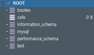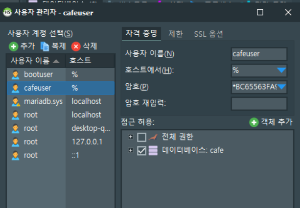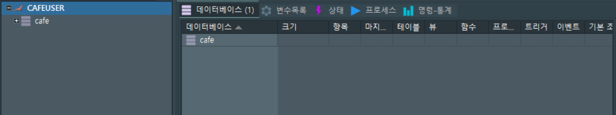 아래와 같이 cafe 데이터베이스만 볼 수 있도록 한다.