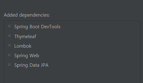dependencies { implementation 'org.springframework.boot:spring-boot-starter-data-jpa' implementation 'org.springframework.boot:spring-boot-starter-thymeleaf' implementation 'org.springframework.boot:spring-boot-starter-web' compileOnly 'org.projectlombok:lombok' developmentOnly 'org.springframework.boot:spring-boot-devtools' annotationProcessor 'org.projectlombok:lombok' providedRuntime 'org.springframework.boot:spring-boot-starter-tomcat' testImplementation 'org.springframework.boot:spring-boot-starter-test' implementation group: 'org.mariadb.jdbc', name: 'mariadb-java-client' }이번 프로젝트에서는 MariaDB를 사용할 것이기 때문에 관련 의존성을 추가해준다.