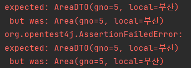 @Test public void 등록확인() { AreaDTO areaDTO = AreaDTO.builder() .gno(5L) .local("부산") .build(); areaService.register(areaDTO); Area area = areaRepository.findById(5L).get(); Assertions.assertThat(area.getGno()).isEqualTo(areaDTO.getGno()); Assertions.assertThat(area.getLocal()).isEqualTo(areaDTO.getLocal()); }일단 하나씩 확인해서 결과를 보았다.