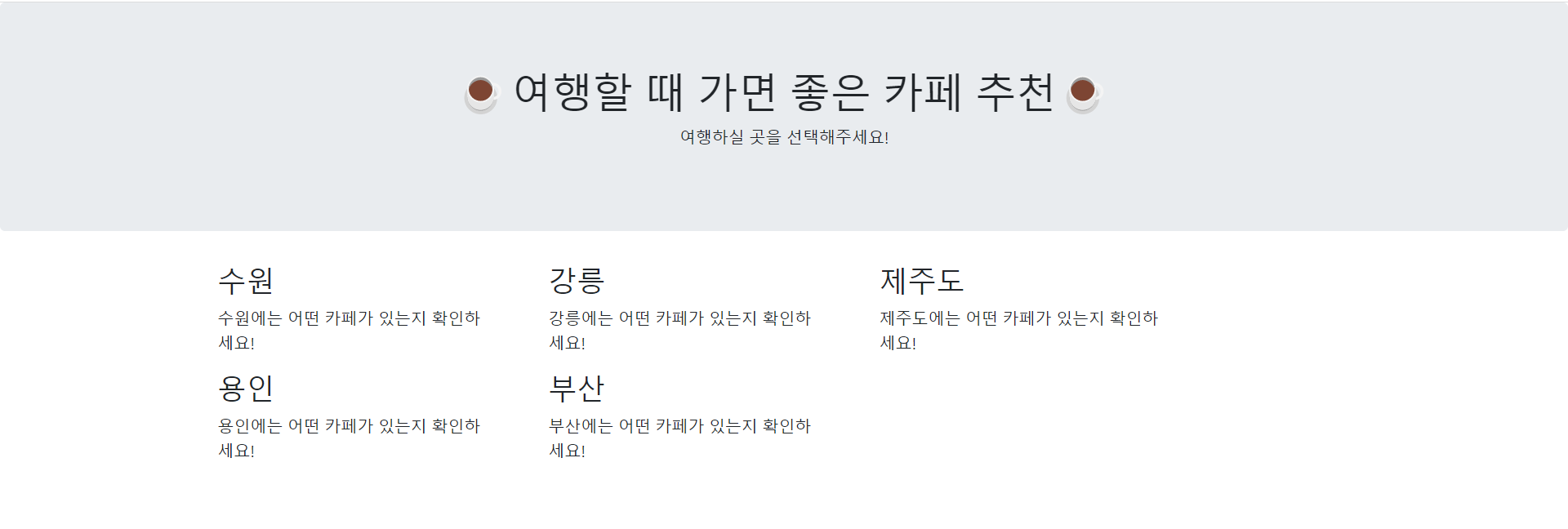<div class="container"> <div class="row"> <div th:each="areas : ${areas}"> <div class="col-sm-11"> <h3>[[${areas.local}]]</h3> <p>[[${areas.local}]]에는 어떤 카페가 있는지 확인하세요!</p> </div> </div> </div> </div>