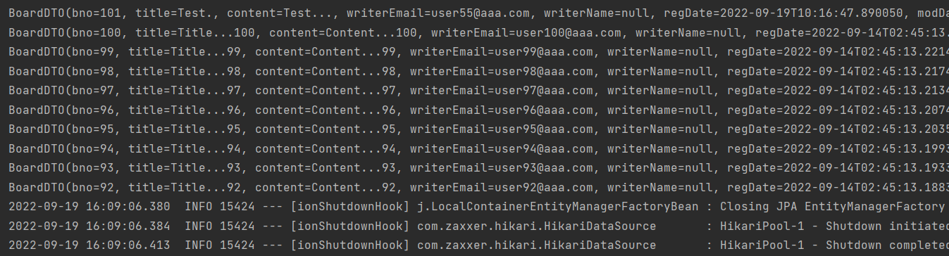 @Test public void testList() { PageRequestDTO pageRequestDTO = new PageRequestDTO(); PageResultDTO<BoardDTO, Object[]> result = boardService.getList(pageRequestDTO); for (BoardDTO boardDTO : result.getDtoList()) { System.out.println(boardDTO); } }위 테스트 코드를 실행시킨 결과, 목록의 한 화면에 필요한 10개의 BoardDTO 객체가 정상적으로 만들어진 것을 확인할 수 있음