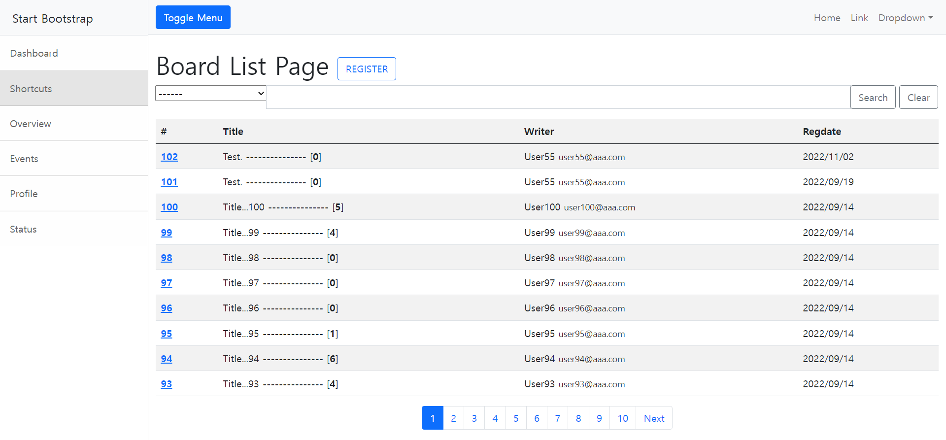 <!DOCTYPE html> <html lang="en" xmlns:th="http:/>/www.thymeleaf.org"> <th:block th:replace="~{/layout/basic :: setContent(~{this::content} )}"> <th:block th:fragment="content"> <h1 class="mt-4">Board List Page <span> <a th:href="@{/board/register}"> <button type="button" class="btn btn-outline-primary">REGISTER </button> </a> </span> </h1> <form action="/board/list" method="get" id="searchForm"> <div class="input-group"> <input type="hidden" name="page" value="1"> <div class="input-group mb-3"> <div class="input-group-prepend"> <select class="custom-select" name="type" style="..."> <option th:selected="${pageRequestDTO.type == null}">------</option> <option value="t" th:selected="${pageRequestDTO.type == 't'}">제목</option> <option value="c" th:selected="${pageRequestDTO.type == 't'}">내용</option> <option value="w" th:selected="${pageRequestDTO.type == 't'}">작성자</option> <option value="tc" th:selected="${pageRequestDTO.type == 't'}">제목 + 내용</option> <option value="tcw" th:selected="${pageRequestDTO.type == 't'}">제목 + 내용 + 작성자</option> </select> </div> <input class="form-control" name="keyword" th:value="${pageRequestDTO.keyword}"> <div class="input-group-append" id="button-addon4"> <button class="btn btn-outline-secondary btn-search" type="button">Search</button> <button class="btn btn-outline-secondary btn-clear" type="button">Clear</button> </div> </div> </div> </form> <table class="table table-striped"> <thread> <tr> <th scope="col">#</th> <th scope="col">Title</th> <th scope="col">Writer</th> <th scope="col">Regdate</th> </tr> </thread> <tbody> <tr th:each="dto : ${result.dtoList}" > <th scope="row"> <a th:href="@{/board/read(bno = ${dto.bno}, page = ${result.page}, type=${pageRequestDTO.type}, keyword = ${pageRequestDTO.keyword})}"> [[${dto.bno}]] </a> </th> <td>[[${dto.title}]] --------------- [<b th:text="${dto.replyCount}"></b>]</td> <td>[[${dto.writerName}]] <small>[[${dto.writerEmail}]]</small> </td> <td>[[${#temporals.format(dto.regDate, 'yyyy/MM/dd')}]]</td> </tr> </tbody> </table> <ul class="pagination h-100 justify-content-center align-items-center"> <li class="page-item " th:if="${result.prev}"> <a class="page-link" th:href="@{/board/list(page= ${result.start -1}, type=${pageRequestDTO.type}, keyword = ${pageRequestDTO.keyword} ) }" tabindex="-1">Previous</a> </li> <li th:class=" 'page-item ' + ${result.page == page?'active':''} " th:each="page: ${result.pageList}"> <a class="page-link" th:href="@{/board/list(page = ${page} , type=${pageRequestDTO.type}, keyword = ${pageRequestDTO.keyword} )}"> [[${page}]] </a> </li> <li class="page-item" th:if="${result.next}"> <a class="page-link" th:href="@{/board/list(page= ${result.end + 1}, type=${pageRequestDTO.type}, keyword=${pageRequestDTO.keyword} )}">Next</a> </li> </ul> </th:block> </th:block> </html>