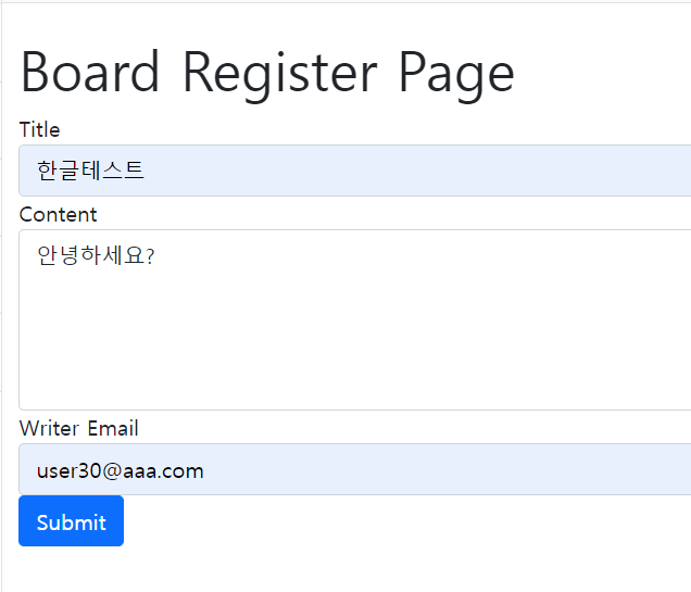 <!DOCTYPE html> <html lang="en" xmlns:th="http://www.thymeleaf.org"> <th:block th:replace="~{/layout/basic :: setContent(~{this::content})}"> <th:block th:fragment="content"> <h1 class="mt-4">Board Register Page</h1> <form th:action="@{/board/register}" th:method="post"> <div class="form-group"> <label>Title</label> <input type="text" class="form-control" name="title" placeholder="Enter Title"> </div> <div class="form-group"> <label>Content</label> <textarea class="form-control" rows="5" name="content"></textarea> </div> <div class="form-group"> <label>Writer Email</label> <input type="email" class="form-control" name="writerEmail" placeholder="Writer Email"> </div> <button type="submit" class="btn btn-primary">Submit</button> </form> </th:block> </th:block> </html>