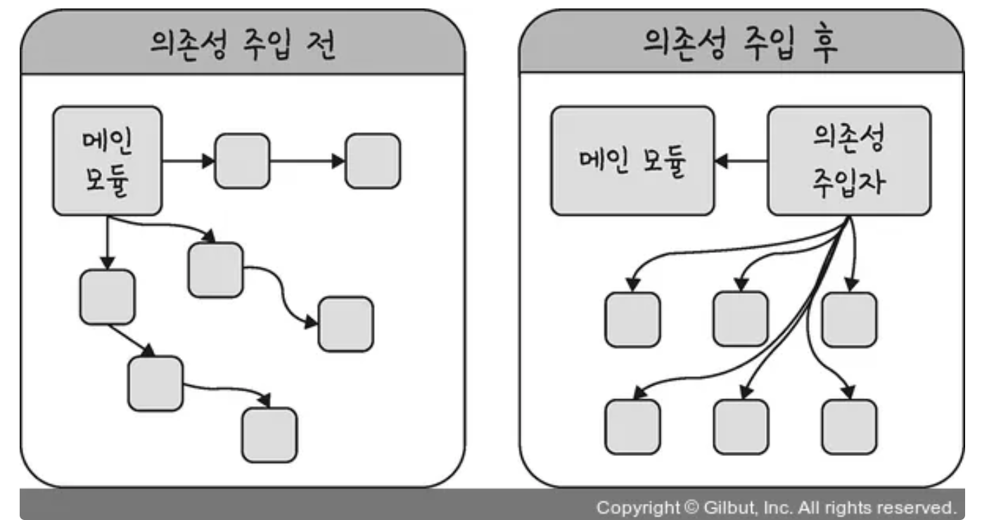 - 메인 모듈이 직접 다른 하위 모듈에 대한 의존성을 주입 → 의존성 주입자(dependency injector)가 간접적으로 의존성을 주입하는 방식