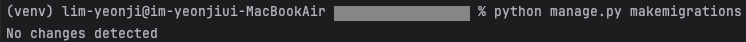 INSTALLED_APPS = [ "django.contrib.admin", "django.contrib.auth", "django.contrib.contenttypes", "django.contrib.sessions", "django.contrib.messages", "django.contrib.staticfiles", "backend", "rest_framework", ]5. 파이참에서 터미널을 열어서 `python manage.py makemigrations` 을 입력한다.