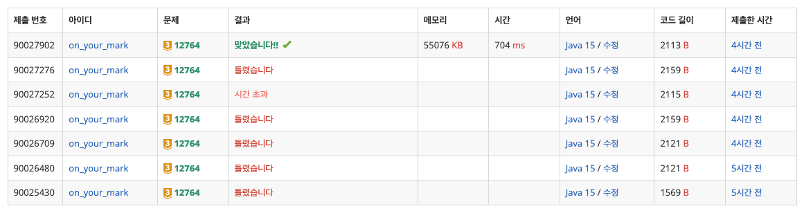 정말.. 다양한.. 시도들을 해봤어요.. 이건가? 하면서 고치다가 시간초과까지 나버림. 하핫 정말 왜 통과 못하는지 도무지 모르겠었는데 해결해서 기분이 좋네용. 햅삐~