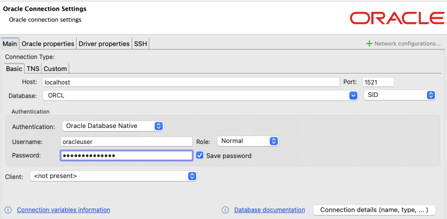 이렇게 설정해줍니다. 특히 Database 줄에서 SID로 변경해주는 것 잊으시면 안됩니다.