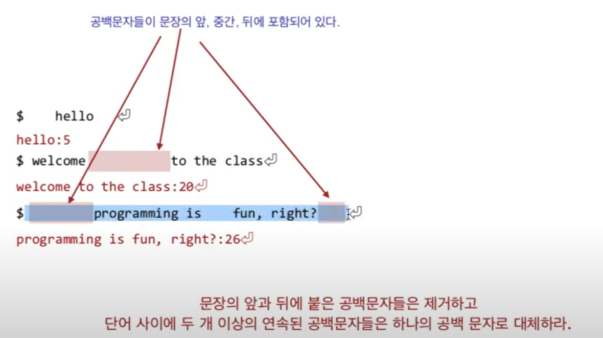 문제 2 /* * 2022-01-23 * 연습문제 2 * 프로그램을 실행하면 $와 한 칸의 공백문자를 출력하고 사용자의 입력을 기다린다. * 문장을 입력하면 문장 그대로와 길이를 출력한다. * 문장의 앞과 뒤에 붙은 공백문자들은 제거하고, 단어 사이에 두 개 이상의 연속된 공백문자들은 하나의 공백문자로 대체한다. */ #include <stdio.h> #include <ctype.h> //white space 문자인지 검사하는 isspace함수 제공 #define BUFFER_SIZE 80 int read_line_with_compression(char compressed[], int limit); int main() { char line[BUFFER_SIZE]; while (1) { printf("$ "); int len = read_line_with_compression(line, BUFFER_SIZE); printf("%s:%d\n", line, len); } return 0; } int read_line_with_compression(char compressed[], int limit) { int ch, i = 0; while ((ch = getchar()) != '\n') { if (i < limit - 1 && (!isspace(ch) || i > 0 && !isspace(compressed[i - 1]))) compressed[i++] = ch; } if (i > 0 && isspace(compressed[i - 1])) i--; compressed[i] = '\0'; return i; }