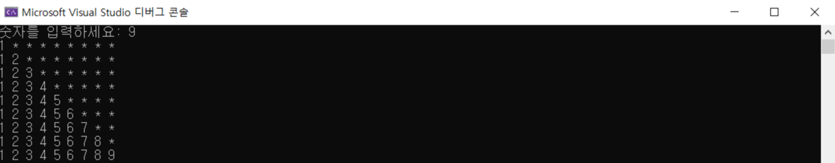 #include <stdio.h> int main() { int num = 0; printf("숫자를 입력하세요: "); scanf_s("%d", &num); for (int i = 1; i <= num; i++) { for (int k = 1; k <= i; k++) printf("%d ", k); for (int j = 0; j <= num - 1 - i; j++) printf("* "); printf("\n"); } return 0; }