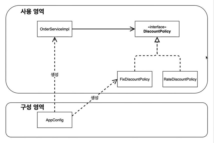 public class AppConfig { public MemberServiceImpl memberService() { return new MemberServiceImpl(memberRepository()); } public MemberRepository memberRepository() { return new MemoryMemberRepository(); } public OrderService orderService() { return new OrderServiceImpl(memberRepository(), discountPolicy()); } public DiscountPolicy discountPolicy() { return new FixDiscountPolicy(); } }
